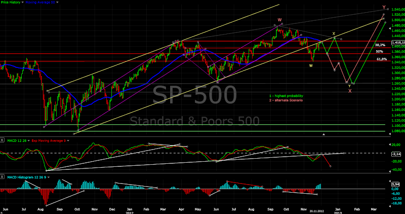 Current thoughts - if I look at the charts I would say that we will see some bounce of the trend line and lower high. A surprise news about resolution of the "fiscal cliff" can send the market to a higher high.... f..cking theater. The European markets are flat and SPX500 lost 45 points which is very very strange. So I can not exclude a sharp rally.