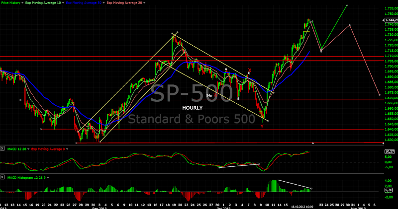The bullish case(green on the charts) - SP500 reached support level, 61,8% retracement, the lower wedge trend line, MA50, MACD the zero line. We have deceleration(reg-green-red-green candles), the histogram turned up, bullish candle formation, the cycles are mature and probably a double bottom on the hourly chart. As long as the price stays above 1680 we should be bullish and expect a move toward the upper wedge trend line.