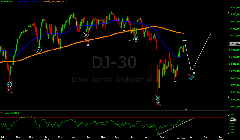 Who said October is a weak month for stocks..... I am bullish since the "3 day wonder", but obviously not bullish enough. Focused on FED/FOMC I have forgotten about ECB..... the market just waiting for the next dose "we will do what every is necessary", PBOC joining the party on Friday cutting rates too.... CBs frenzy:) Well I was wrong for the short term - all over the place signs that the first leg higher is finishing and than boooom ECB/PBOC blows away the nice pattern:). I am sorry, I could not calculate this. Corrections are tricky and mutate all the time especially when CBs interfere with the markets. Interesting is that every index SP500,DJIA,Nasdaq,Russell,DAX has different pattern - the common is it is corrective and I expect all indexes to synchronize with one more leg higher, but the long term correction should not be finished. Intermediate term - it is difficult to say, I expect more bullish outcome double zig-zag higher or more exotic LD followed by one more leg higher, but the bearish scenario (the next move lower to begin soon) should not be discarded at the moment. See cycles below for some thoughts intermediate/long term. The strong move does not change my intermediate/long term scenario exactly the opposite even a stronger confirmation that this is not a bear market. The "3-day crash" completely retraced, move above resistance levels and MAs without any effort... CBs still control the market.