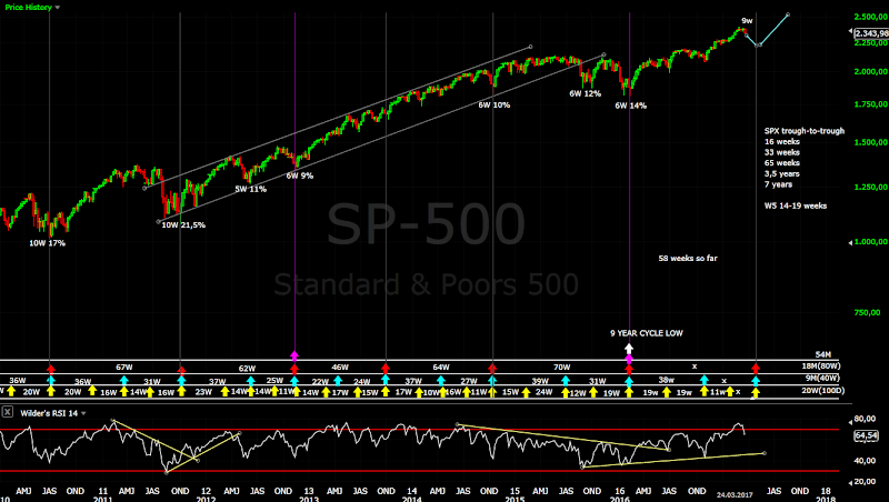 We saw a move higher as expected.... no strong case either for bullish or bearish outcome, but I see more and more hints that the top is behind us. Europe looks like finished ED with reversal candle and RSI/MACD divergence, DJT with clear impulse lower, XLF you could count diagonal lower, RUT you can count an impulse lower. SPX on the daily chart RSI broke below the trend line and it is not recovering quickly just tested twice the broken trend line. It takes too long for the index to rally 7 trading days already. McClellan Oscillator - compared historically after a move below -80 the correction was already running, but it is so shallow that you do not think about correction. "Recovery" follows for 1-2 weeks but it is weak and reversal follows - for more than 2 weeks we have exactly the same price behavior. Higher high could not be ruled out, but I think the top is behind us.