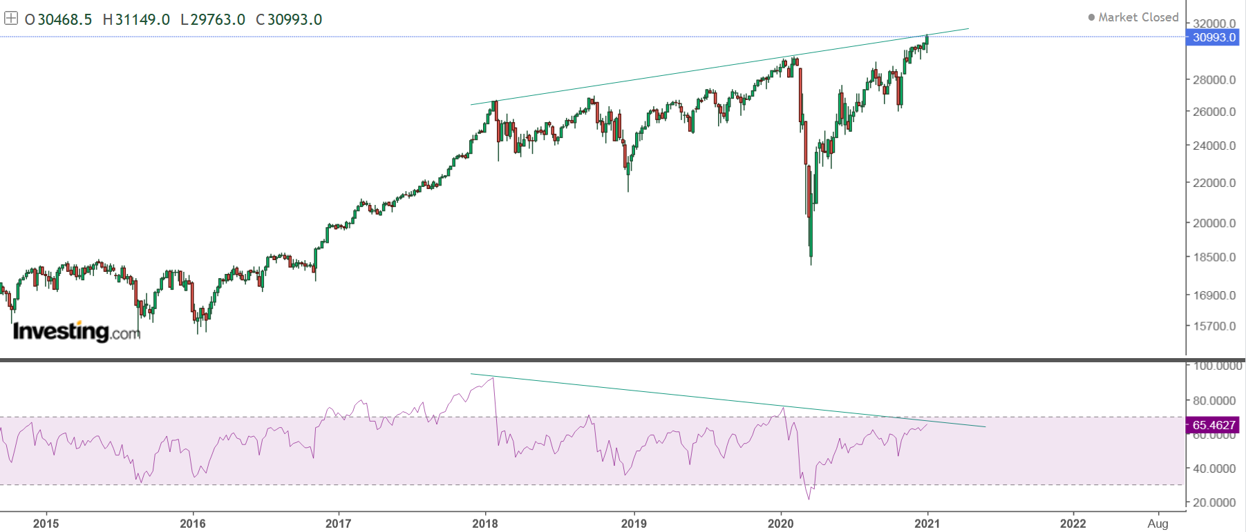 Long term - DJI weekly chart another touch of the trend line with double RSI divergence does not make me feel bullish.